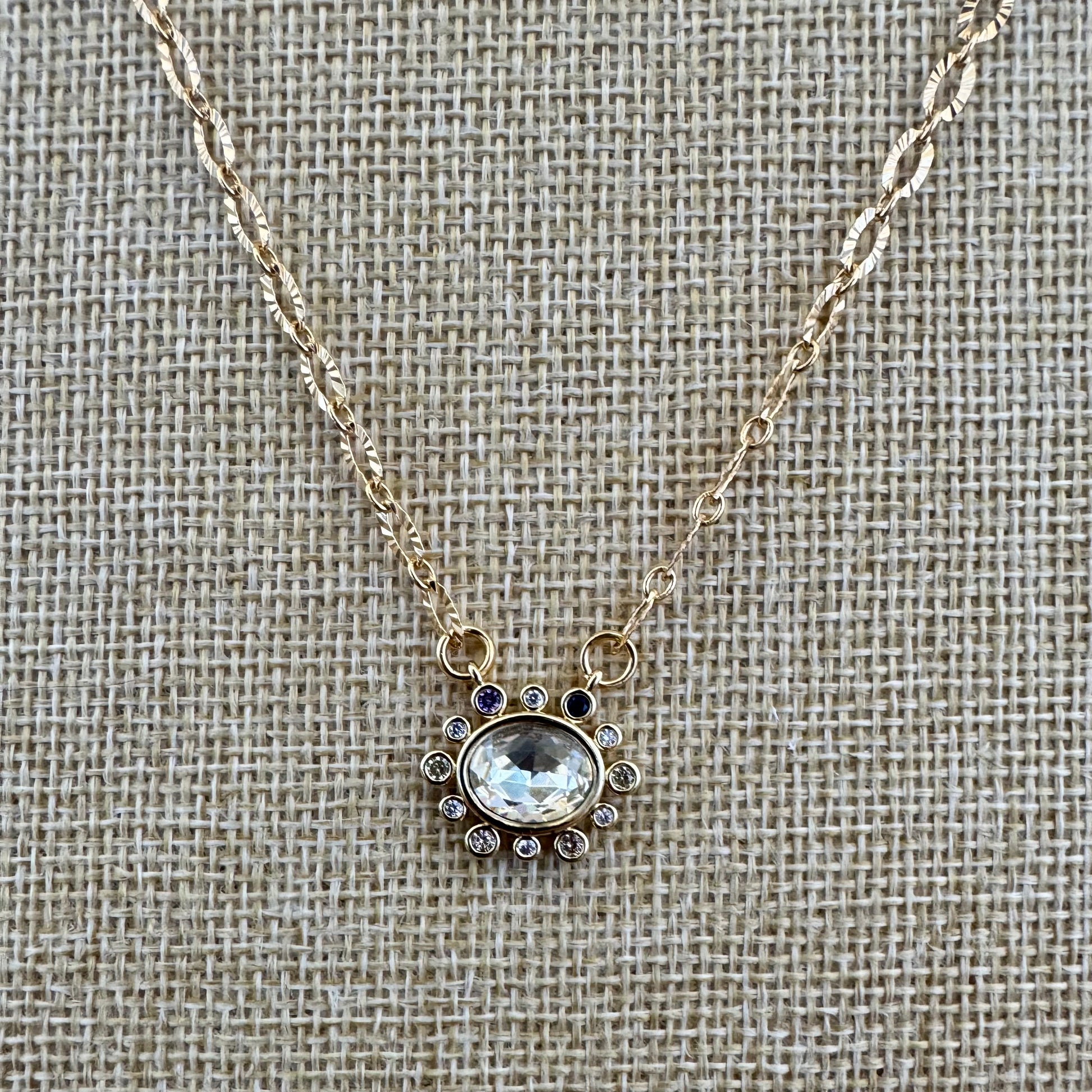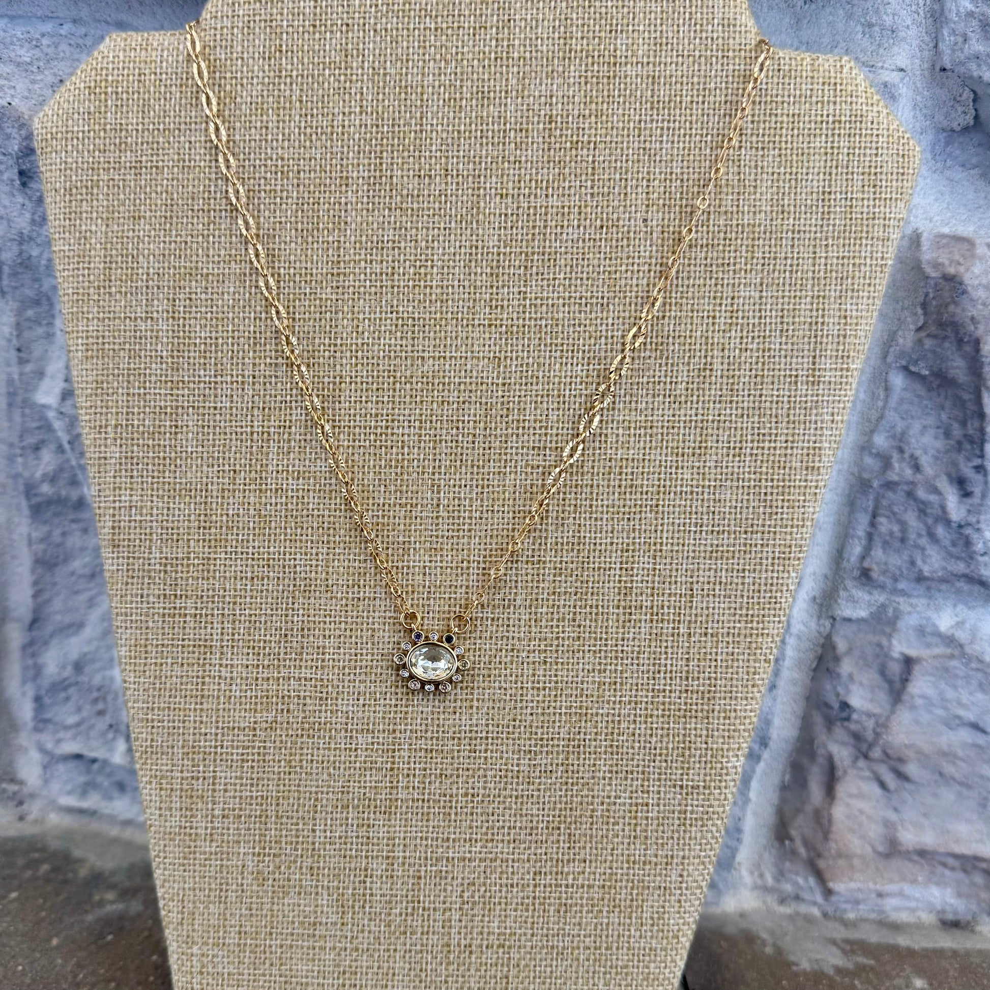 Add a pop of color to your jewelry collection with our gold chain necklace. Featuring a unique clear stone pendant adorned with multi-colored accents, this necklace is sure to be a standout piece. Made with high-quality materials, it's a stylish and timeless addition to any outfit.