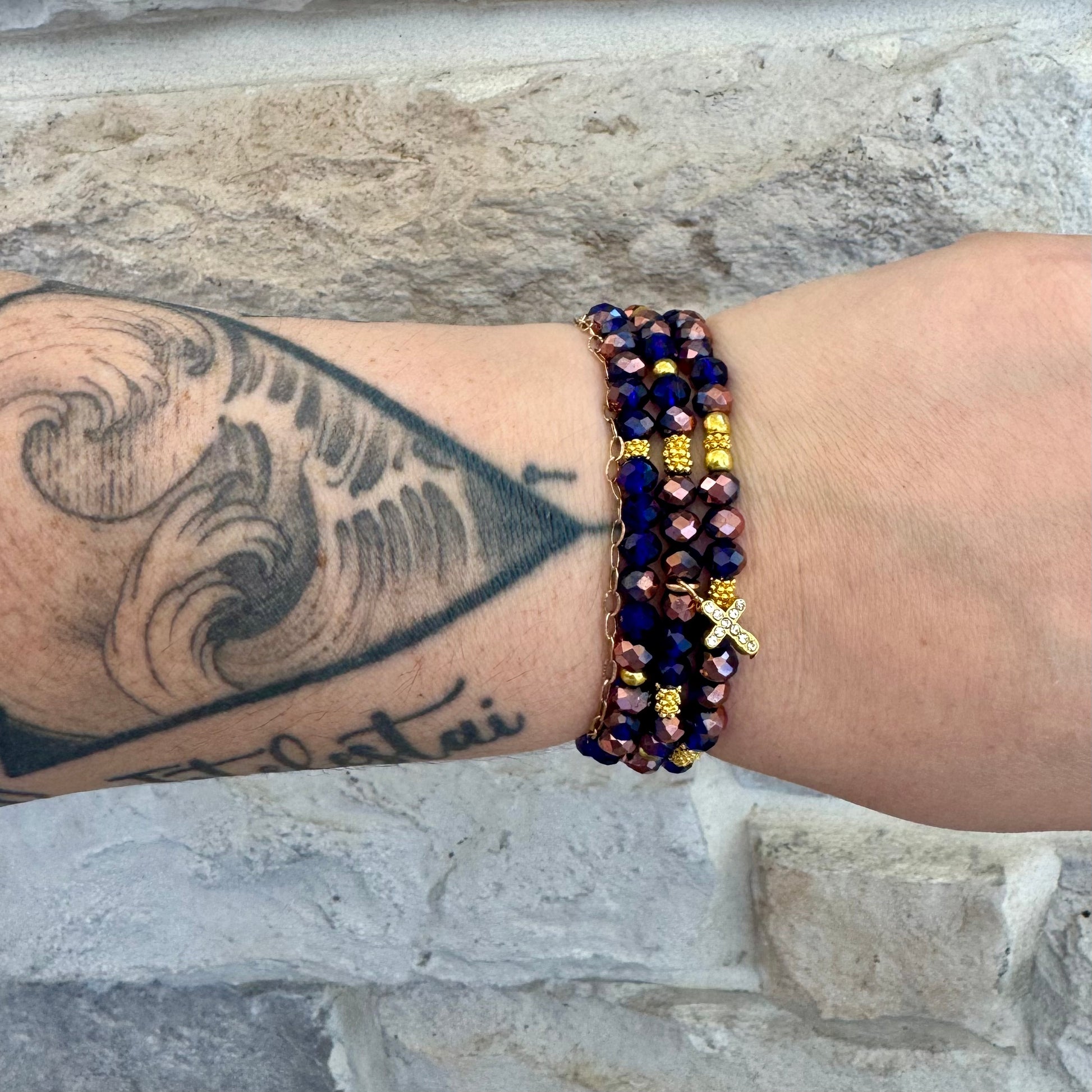 "Create a bold and striking look with our Blueberry Stack. This 3 piece set features reflective multi blue tone beaded bracelets, accented with gold textured beads. Complete the look with the eye-catching cross pendant. Stand out with this unique and stylish set!"