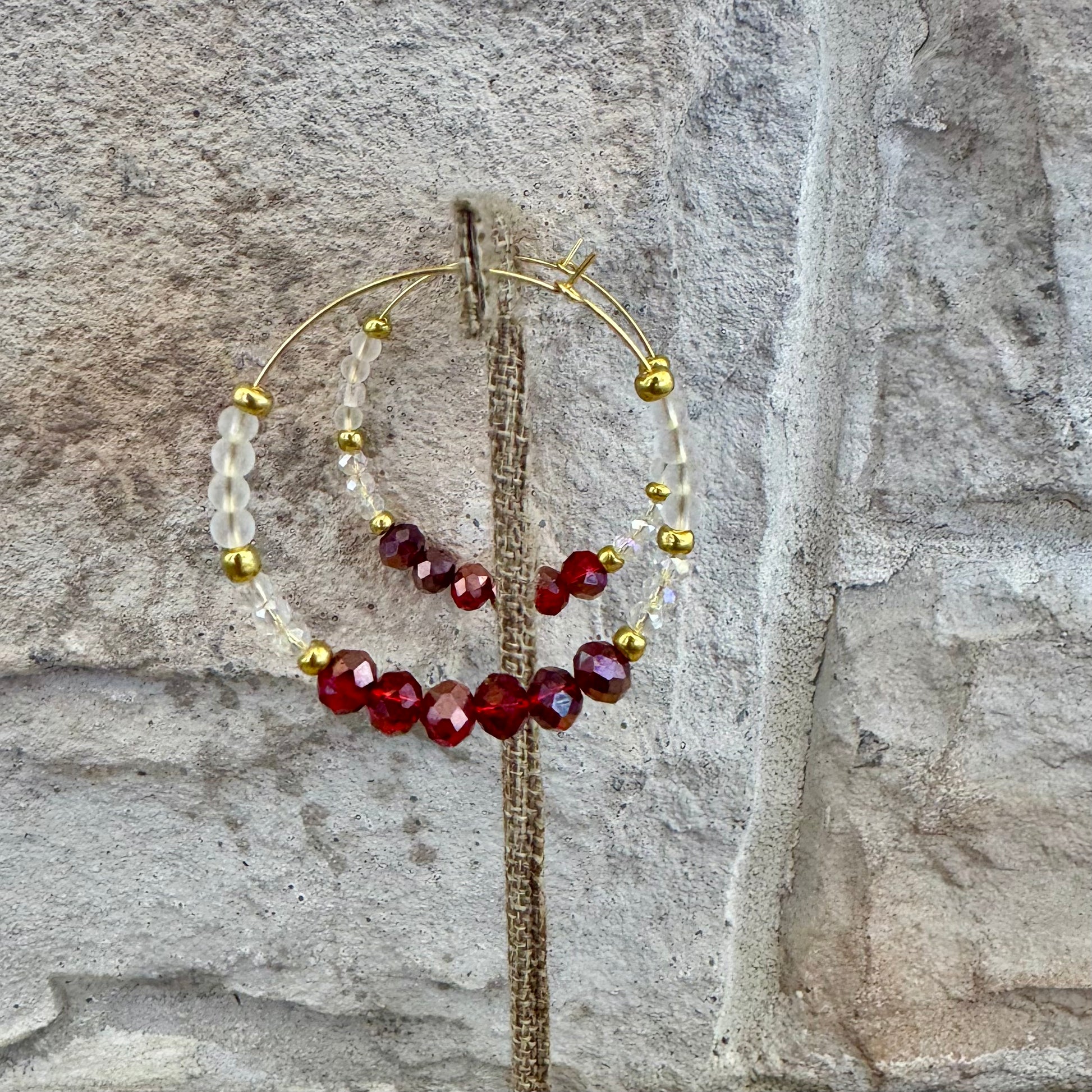 These Pomegranate Earrings are the perfect accessory for any outfit! The hoop design adds a touch of elegance while the deep red and clear beads provide a pop of color. Plus, they are lightweight and comfortable to wear all day long. Elevate your style with these beautiful earrings!